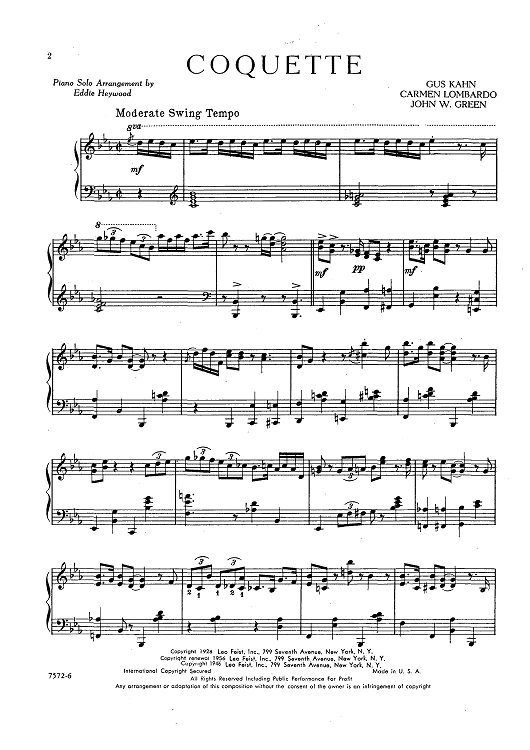 Digital Sheet Music for Coquette by Gus Kahn, Johnny Green, Carmen Lombardo, Eddie Heywood scored for Piano Solo; id:430079