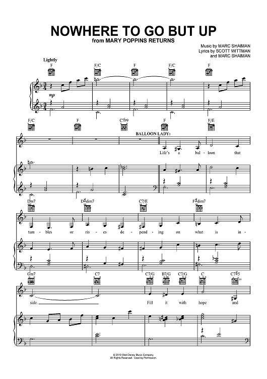 Digital Sheet Music for Nowhere To Go But Up - from Mary Poppins Returns by Marc Shaiman, Scott Wittman scored for Piano/Vocal/Chords; id:467072