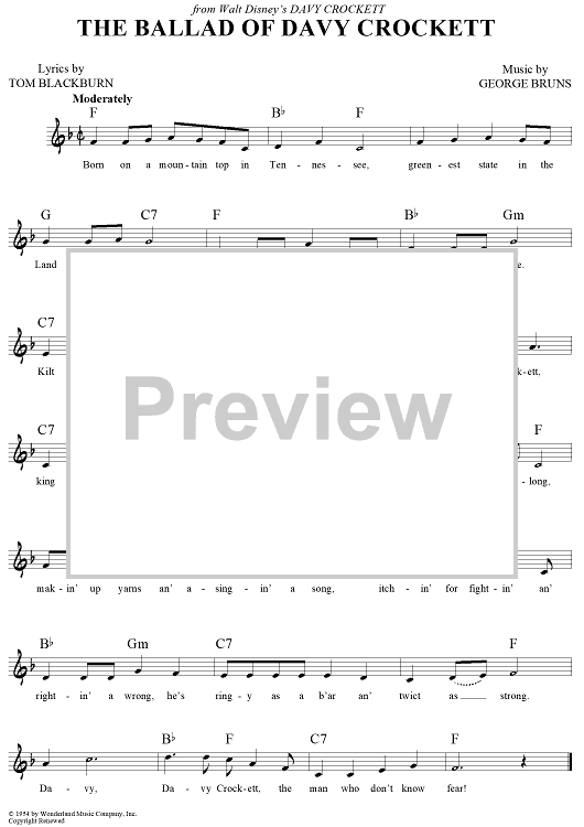 Digital Sheet Music for The Ballad Of Davy Crockett by Tom Blackburn, George Bruns scored for Lead Sheet; id:439642