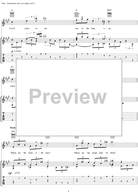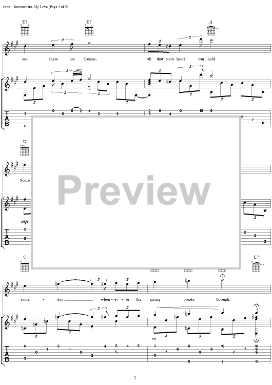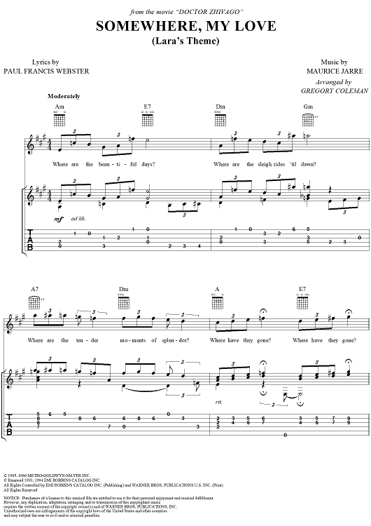 Digital Sheet Music for Somewhere, My Love (Lara's Theme) by Paul Francis Webster, Gregory Coleman, Maurice Jarre scored for Guitar Tab/Vocal; id:120262