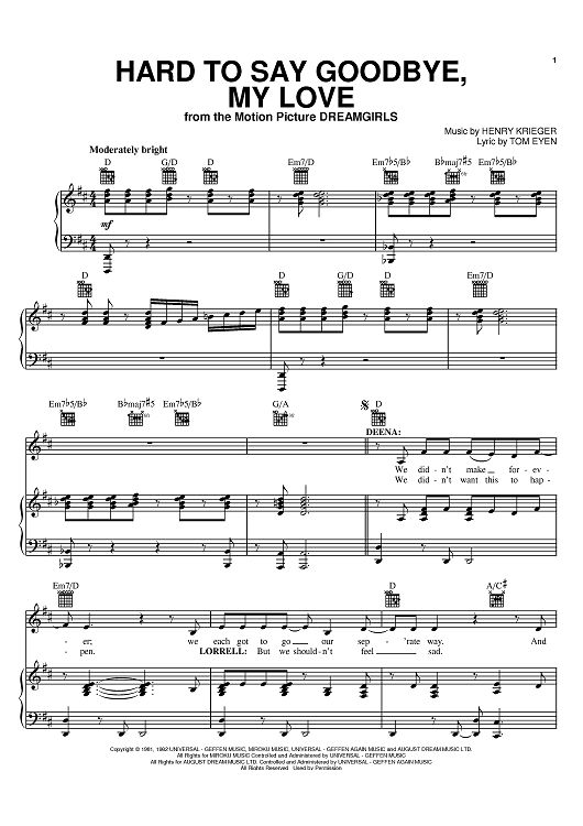 Digital Sheet Music for Hard To Say Goodbye, My Love by Henry Krieger, Tom Eyen, Beyonce scored for Piano/Vocal/Chords; id:395768
