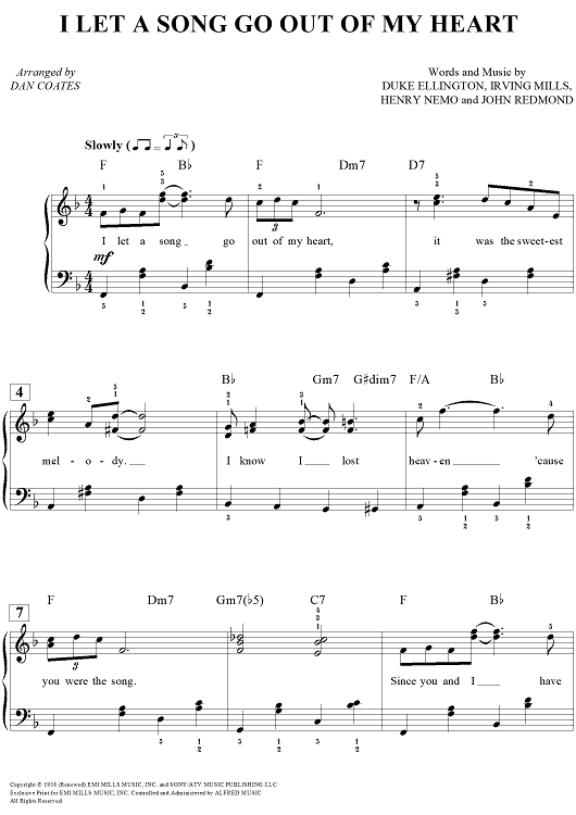 Digital Sheet Music for I Let A Song Go Out Of My Heart by Dan Coates, Duke Ellington, Irving Mills, Henry Nemo, John Redmond scored for Easy Piano/Vocal/Chords; id:449650