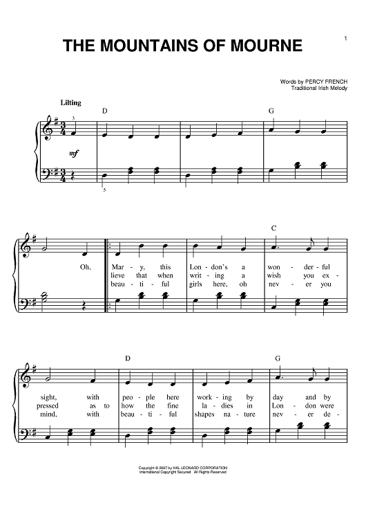 Digital Sheet Music for The Mountains Of Mourne by Percy French scored for Easy Piano; id:397275