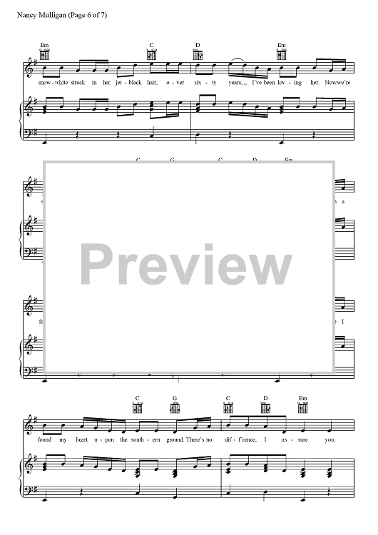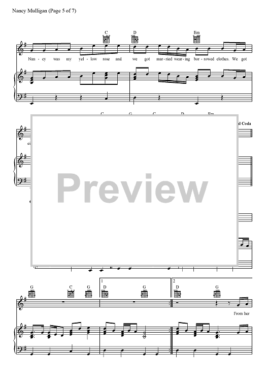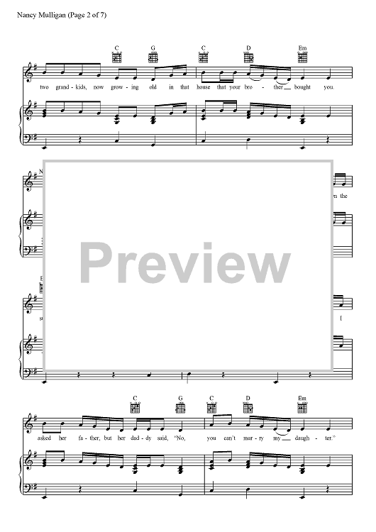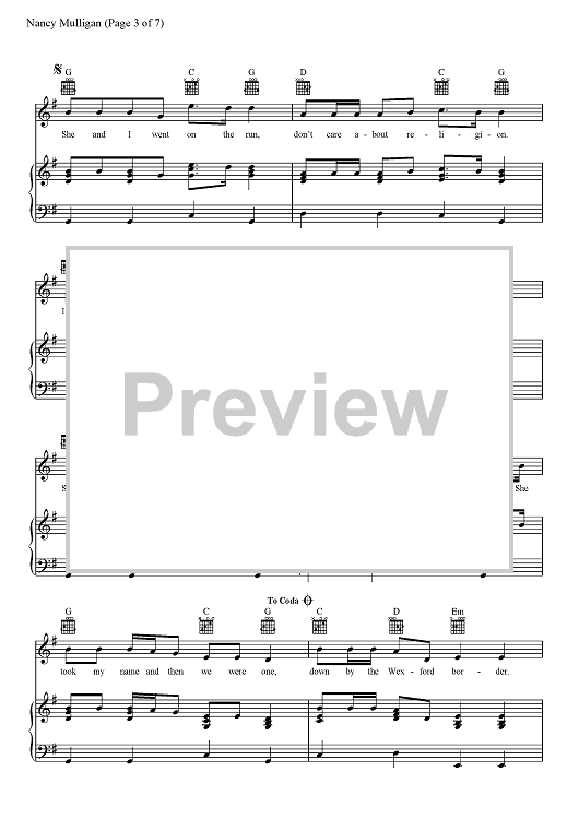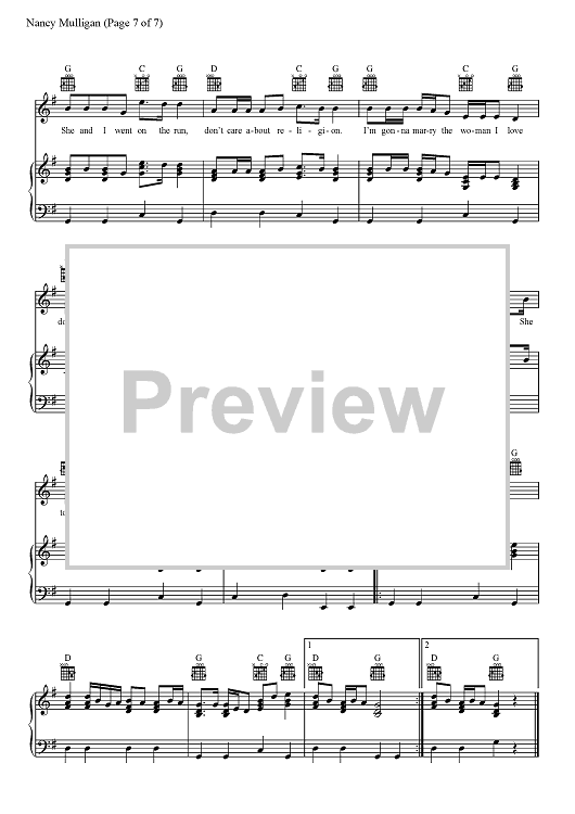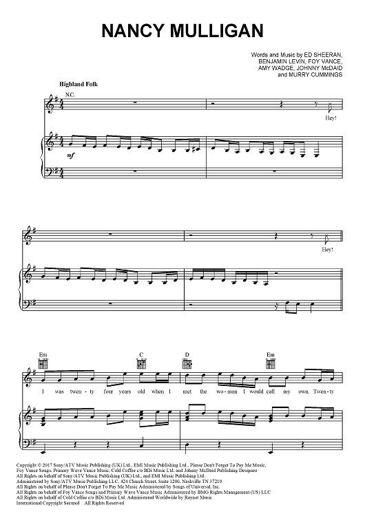 Digital Sheet Music for Nancy Mulligan by Benjamin Levin, Ed Sheeran, John McDaid, Amy Wadge, Foy Vance, Murray Cummings scored for Piano/Vocal/Chords; id:464617