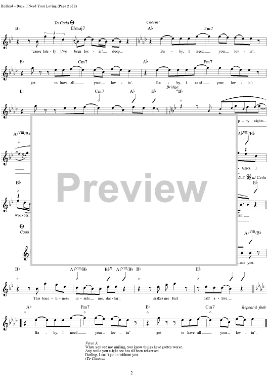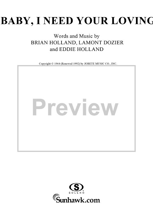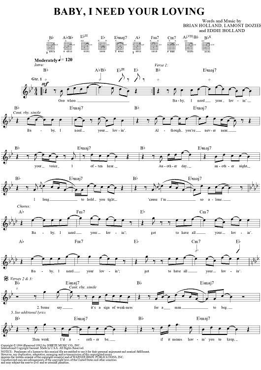 Digital Sheet Music for Baby, I Need Your Loving by Four Tops, Lamont Dozier, Kenn Chipkin, Brian Holland, Eddie Holland scored for Guitar Tab/Vocal; id:266502