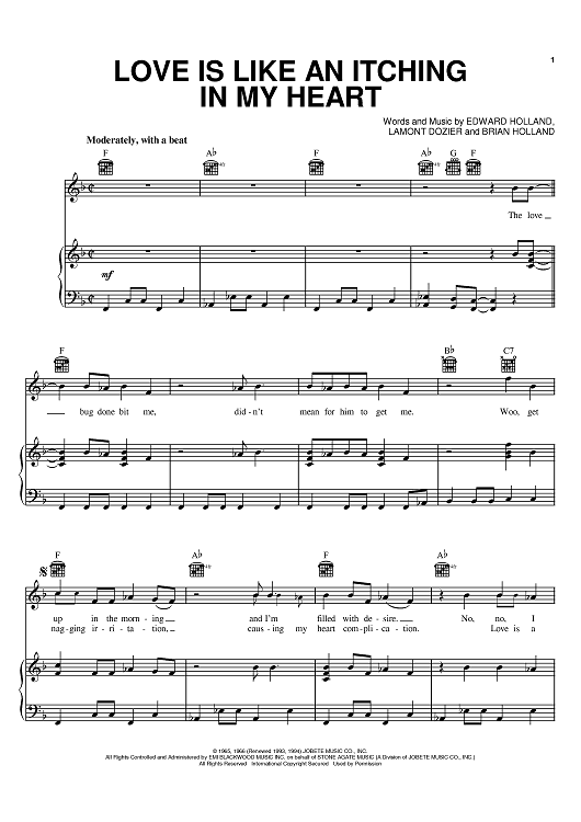Digital Sheet Music for Love Is Like An Itching In My Heart by Diana Ross, Lamont Dozier, Brian Holland, Eddie Holland, The Supremes scored for Piano/Vocal/Chords; id:375268