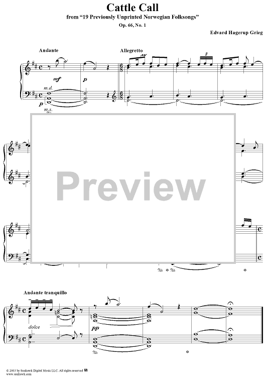 Digital Sheet Music for Cattle Call by Edvard Grieg scored for Piano Solo; id:268086