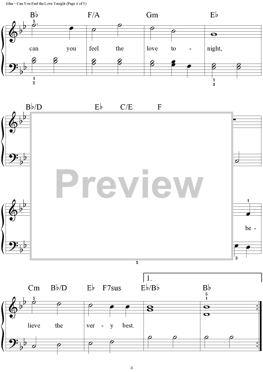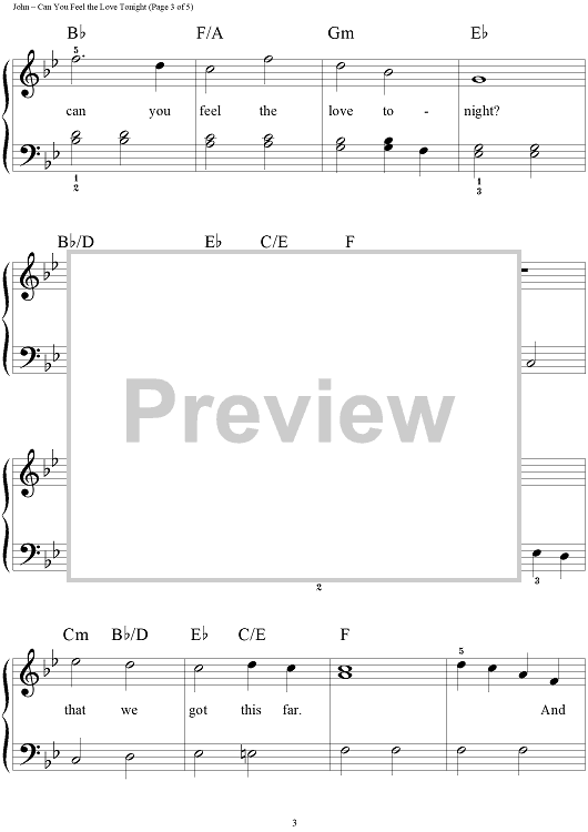 Digital Sheet Music for Can You Feel The Love Tonight by Elton John, Tim Rice, Richard Bradley scored for Big Note Piano; id:287475