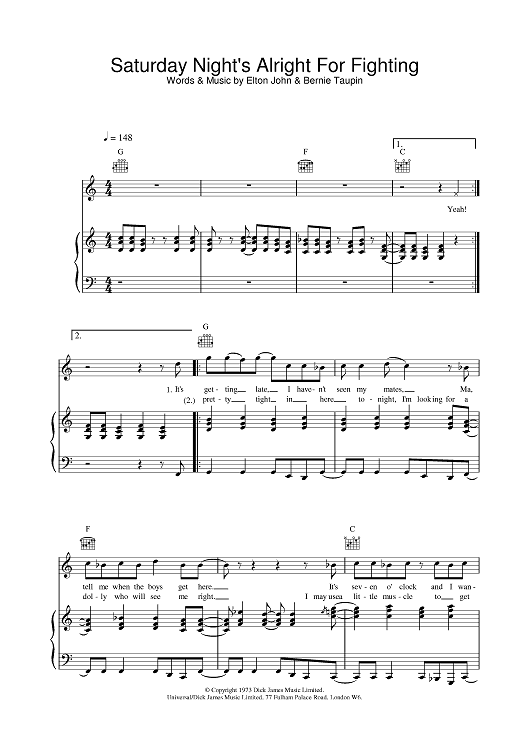 Digital Sheet Music for Saturday Night's Alright For Fighting by Elton John, Bernie Taupin scored for Piano/Vocal/Chords; id:378925