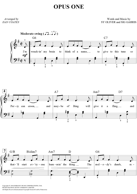 Digital Sheet Music for Opus One by Dan Coates, Sy Oliver, Sig Garris scored for Easy Piano/Vocal/Chords; id:457560