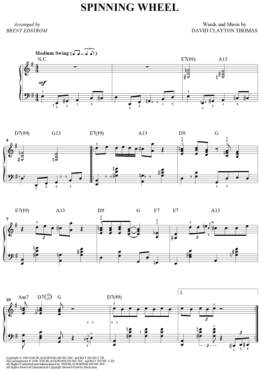 Digital Sheet Music for Spinning Wheel by David Clayton Thomas, Brent Edstrom scored for Piano Solo; id:462795