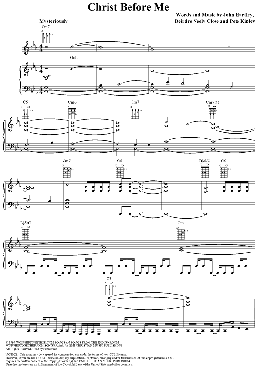 Digital Sheet Music for Christ Before Me by Margaret Becker, John Hartley, Pete Kipley, Deirdre Neely Close scored for Piano/Vocal/Chords; id:266649