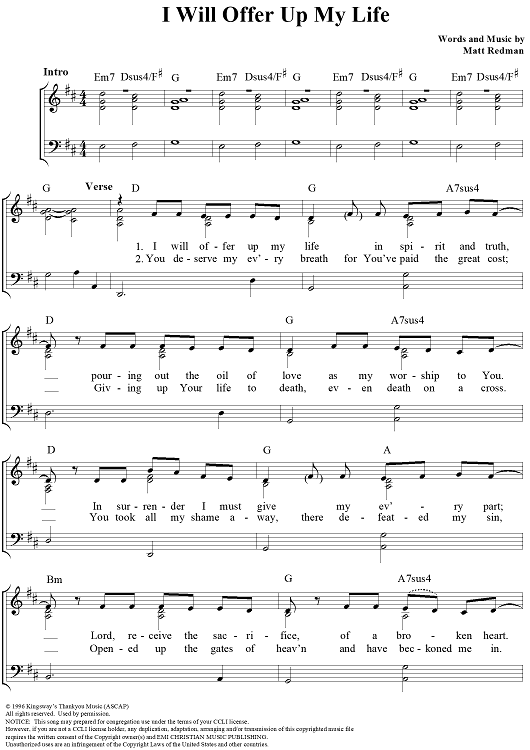 Digital Sheet Music for I Will Offer Up My Life by Matt Redman scored for Piano/Vocal/Chords; id:95472