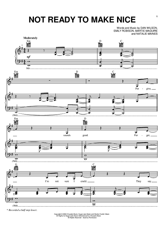 Digital Sheet Music for Not Ready To Make Nice by The Chicks, Dan Wilson, Emily Robison, Martie Maguire, Natalie Maines scored for Piano/Vocal/Chords; id:390882