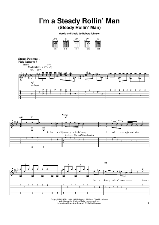 Digital Sheet Music for I'm A Steady Rollin' Man (Steady Rollin' Man) by Eric Clapton, Robert Johnson scored for Easy Guitar Tab; id:381000