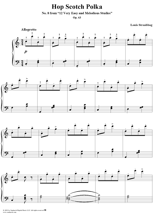 Digital Sheet Music for Hop Scotch Polka, Op. 63, No. 8, from "Twelve Very Easy and Melodious Studies" by Louis Streabbog scored for Piano Solo; id:294872
