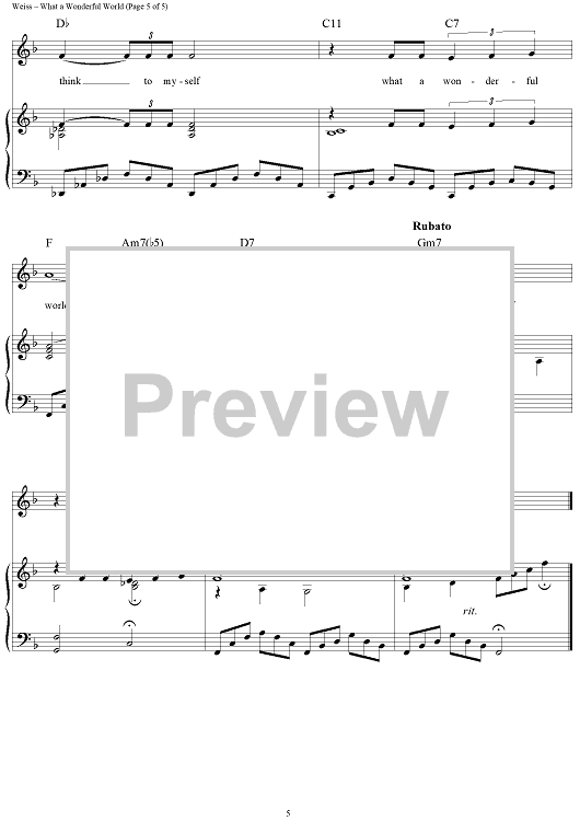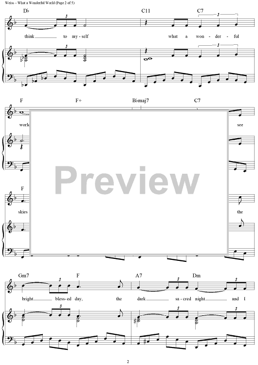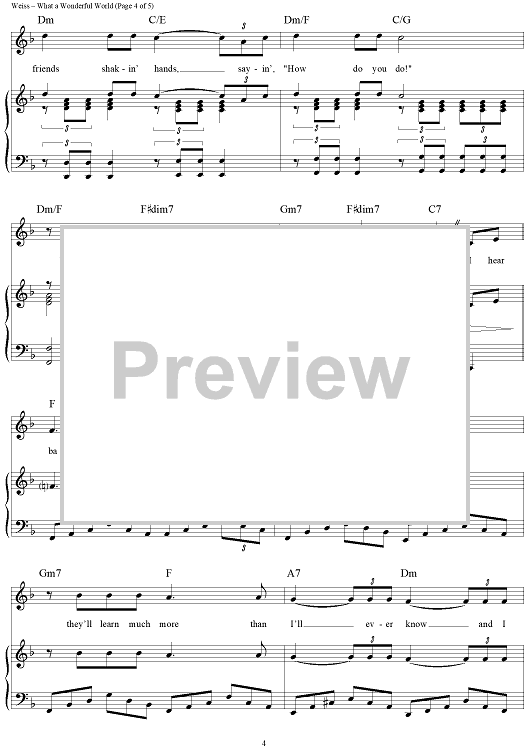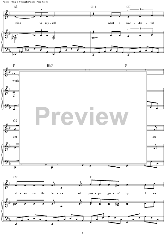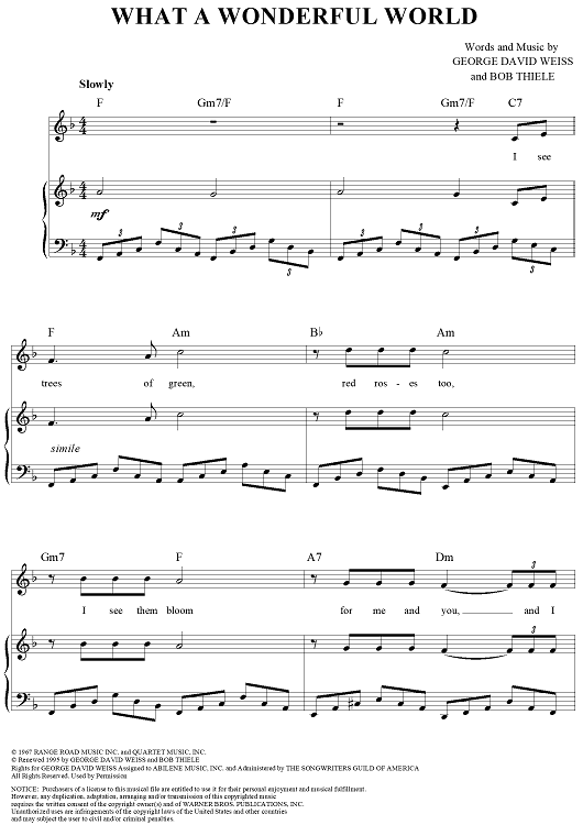 Digital Sheet Music for What A Wonderful World by Louis Armstrong, George Weiss, Bob Thiele, Anne Murray, Eva Cassidy, Michael Buble, Kenny G scored for Piano/Vocal/Chords; id:120651