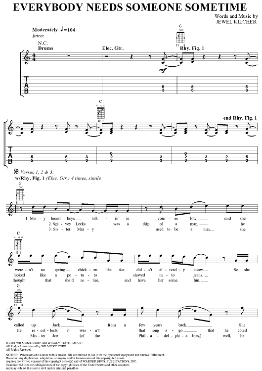 Digital Sheet Music for Everybody Needs Someone Sometime by Jewel, Jewel Kilcher scored for Guitar Tab/Vocal; id:288386