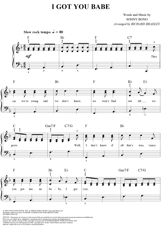 Digital Sheet Music for I Got You Babe by Richard Bradley, Sonny Bono, Sonny & Cher scored for Easy Piano/Vocal; id:283798
