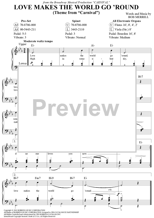 Digital Sheet Music for Love Makes the World Go 'Round by Bob Merrill scored for Easy Organ/Vocal; id:251909