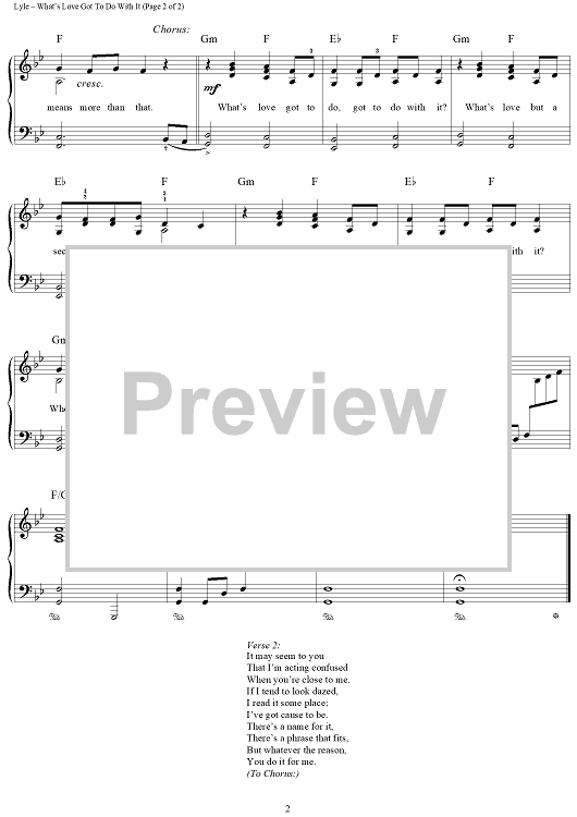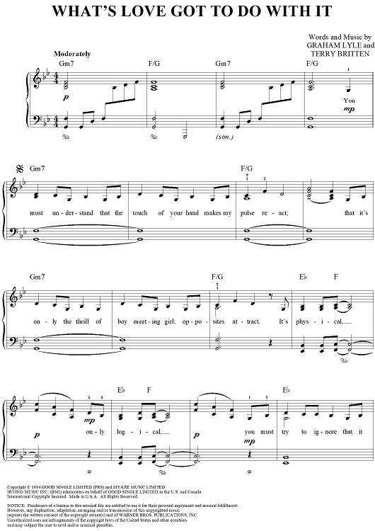 Digital Sheet Music for What's Love Got To Do With It by Tina Turner, Graham Lyle, Terry Britten scored for Easy Piano/Vocal; id:119710