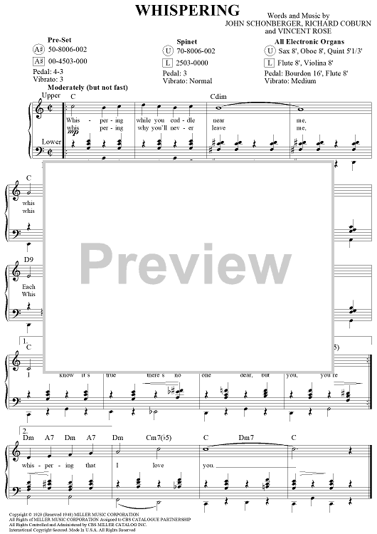 Digital Sheet Music for Whispering by Vincent Rose, Richard Coburn, John Schonberger scored for Easy Organ/Vocal; id:257564