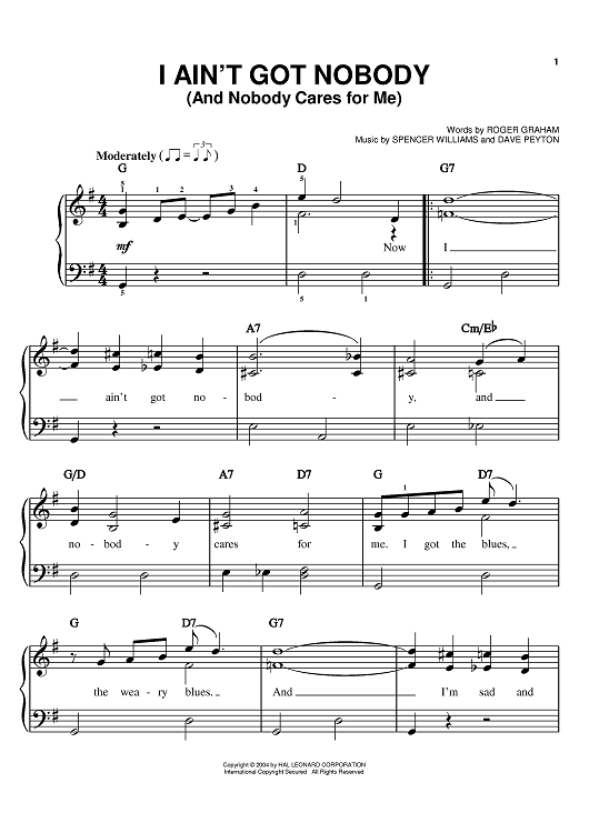 Digital Sheet Music for I Ain't Got Nobody (And Nobody Cares For Me) by Bessie Smith, Louis Armstrong, Fats Waller, Spencer Williams, Roger Graham, Dave Peyton scored for Easy Piano; id:373846