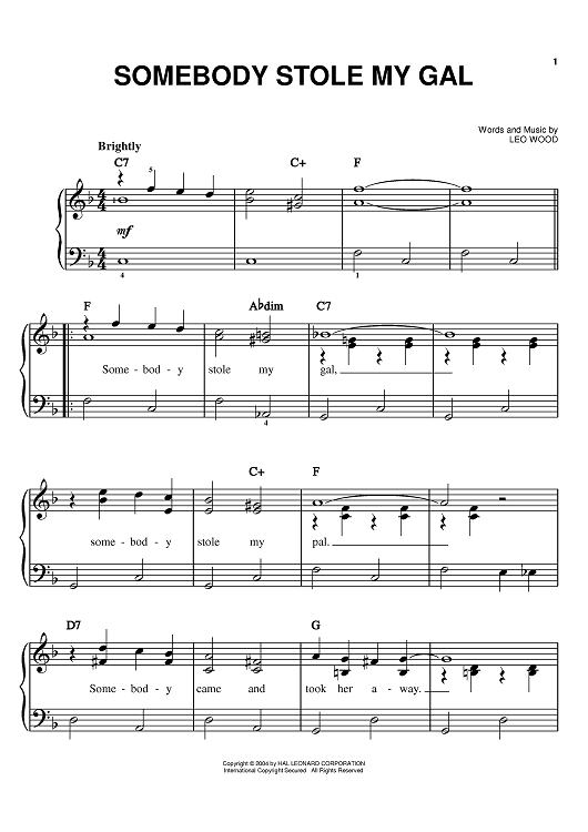 Digital Sheet Music for Somebody Stole My Gal by Fats Waller, Leo Wood, Bix Beiderbecke, Benny Goodman scored for Easy Piano; id:373872