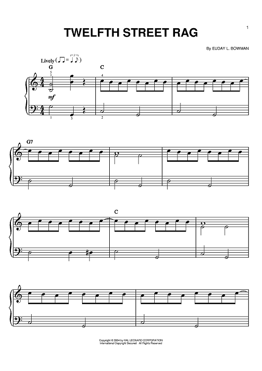 Digital Sheet Music for Twelfth Street Rag by Louis Armstrong, Fats Waller, Les Paul, Euday L. Bowman scored for Easy Piano; id:373882