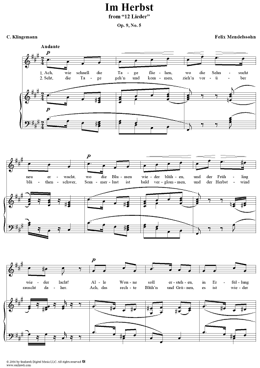 Digital Sheet Music for Twelve Lieder, Op. 9, No. 5: "In Autumn" (Im Herbst) by Felix Mendelssohn scored for Voice/Piano; id:252163