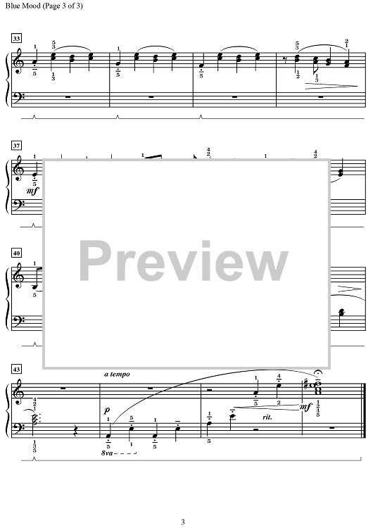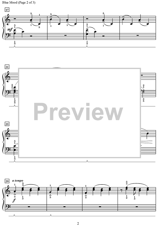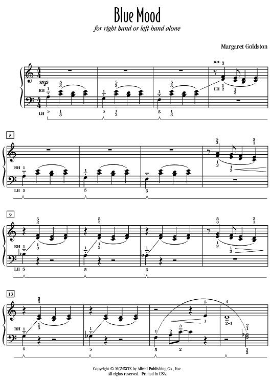 This song is written to be played with either the right or the left hand, alone. Developing strength and independence of each hand is a worthy goal for every pianist. "Blue Mood" will assist the early intermediate level student with the development of either hand using a legato, "wistful," blues style. Fingering is provided for both hands, and pedaling and articulation markings provide a good map for interpretation.