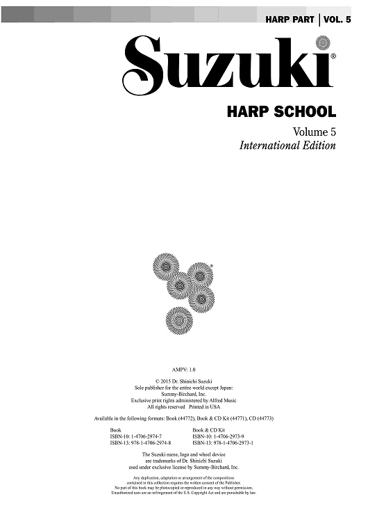 The Suzuki Method® of Talent Education is based on Dr. Shinichi Suzuki's view that every child is born with ability, and that people are the product of their environment. According to Dr. Suzuki, a world-renowned violinist and teacher, the greatest joy an adult can know comes from developing a child's potential so he/she can express all that is harmonious and best in human beings. Students are taught using the "mother-tongue" approach. The latest addition to the method is the International Edition of Suzuki Harp School, Volume 5.
