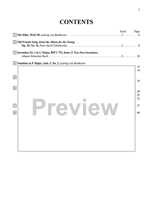 The contents have changed to include Romantic pieces: Schumann's "About Foreign Lands and People" and Chopin's "Waltz in A Minor." Daquin's "The Cuckoo" has been moved here from Book 6. Schumann's "First Loss" and "Siciliana" as well as J. S. Bach's "Prelude in C" have been permanently removed.