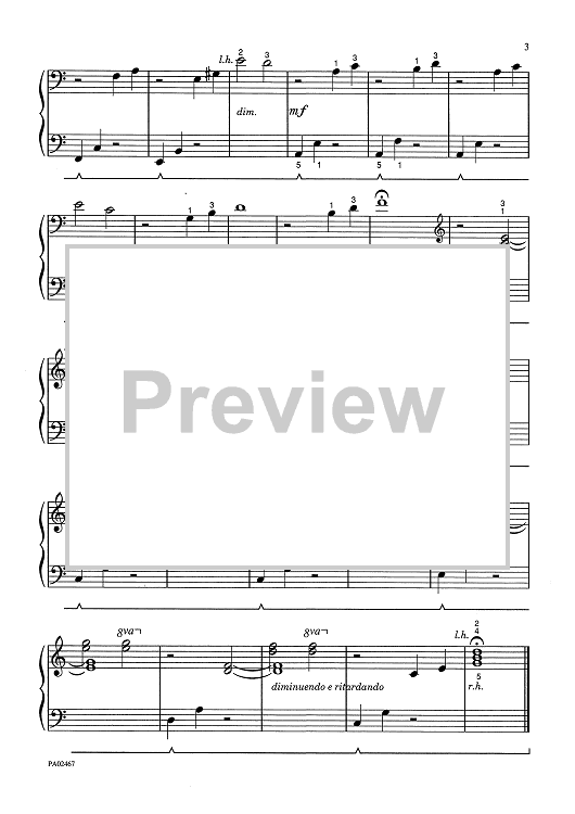 What a wonderful opportunity for expressive playing! This cross-hands piece is gentle in mood -- an unfrenzied performance piece. The moves are graceful, the dissonances easy on the ear. Appealing for players of any age.