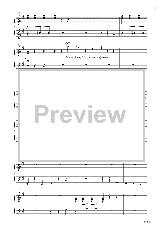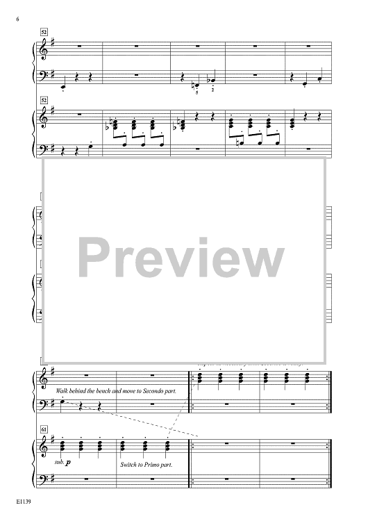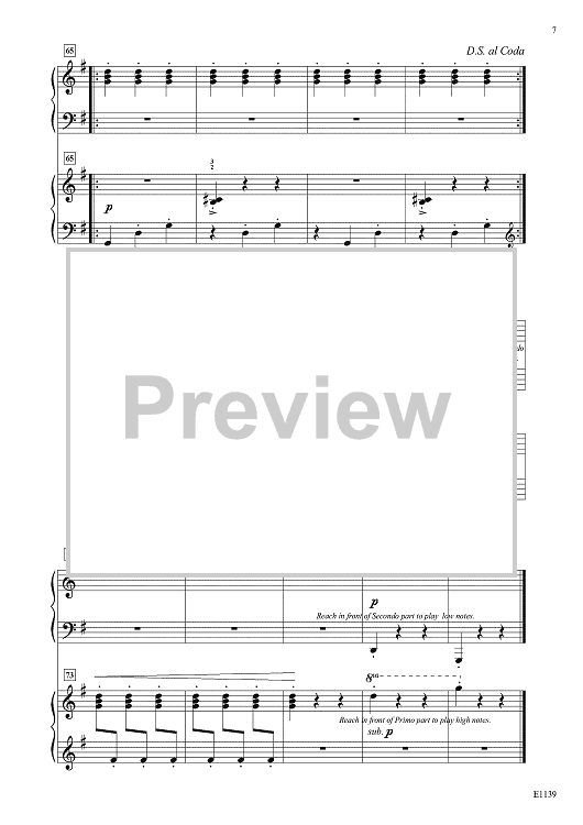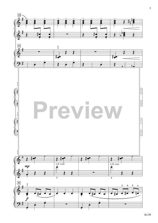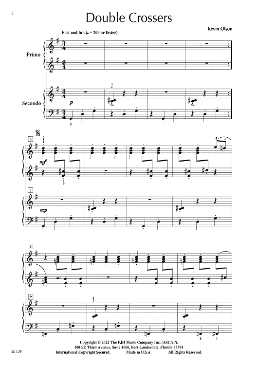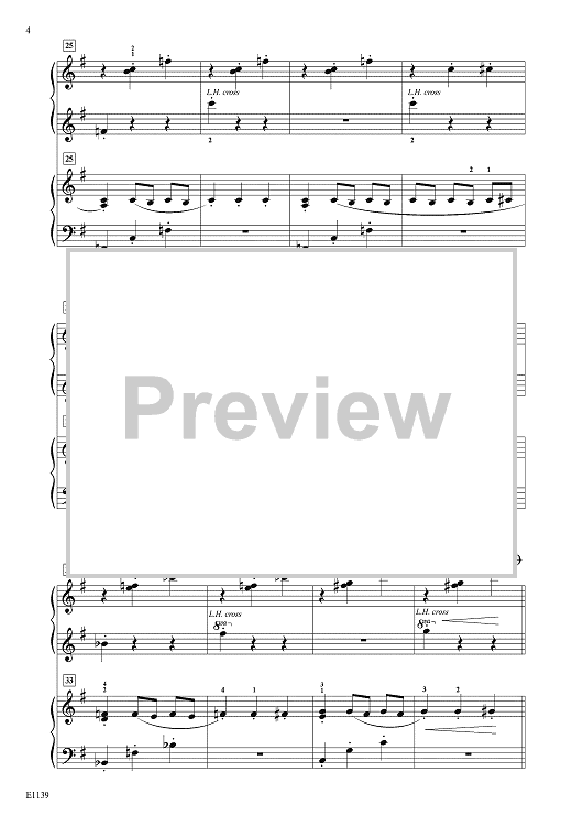 A fast and fun duet for one piano, four hands. Jazz harmonies and frequent accidentals provide a unique challenge to this character piece. As the title suggests, there are frequent hand crossings within each individual part. The music progresses to a climactic finish in which performers duel by reaching over one another to play their parts at the piano. A must-have piece to perform for any studio recital.