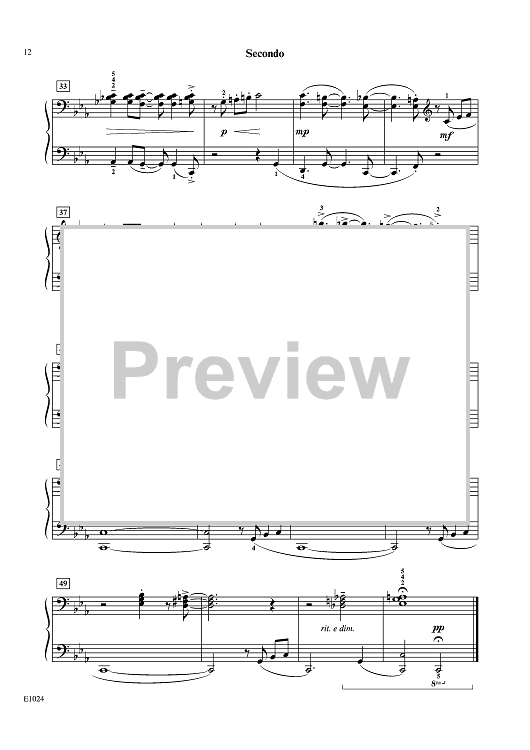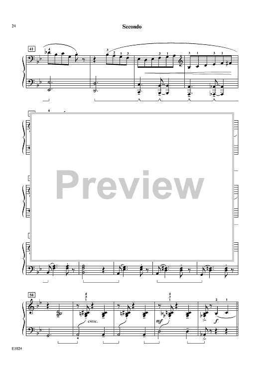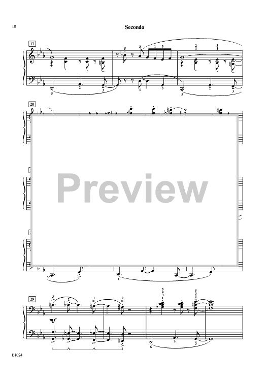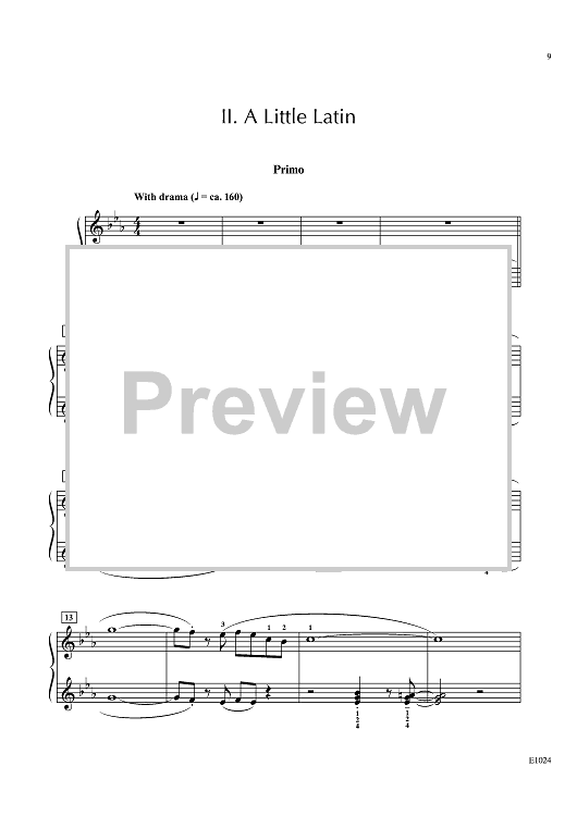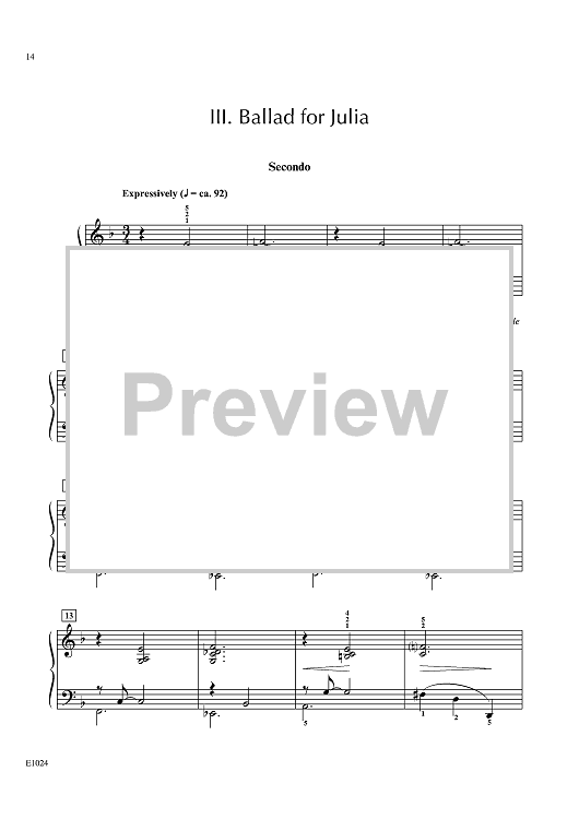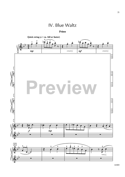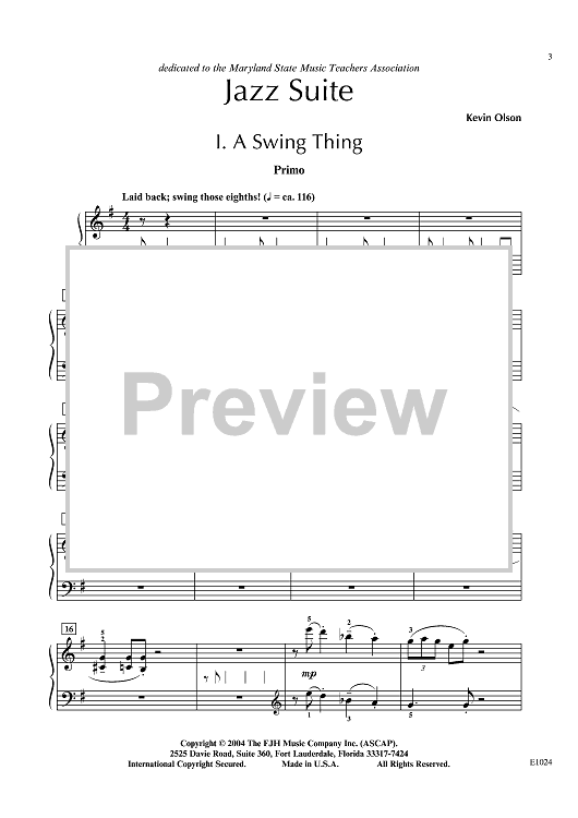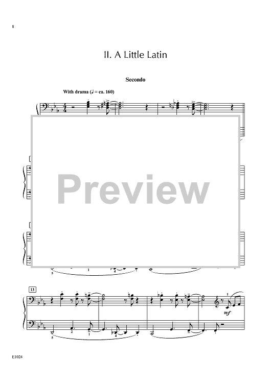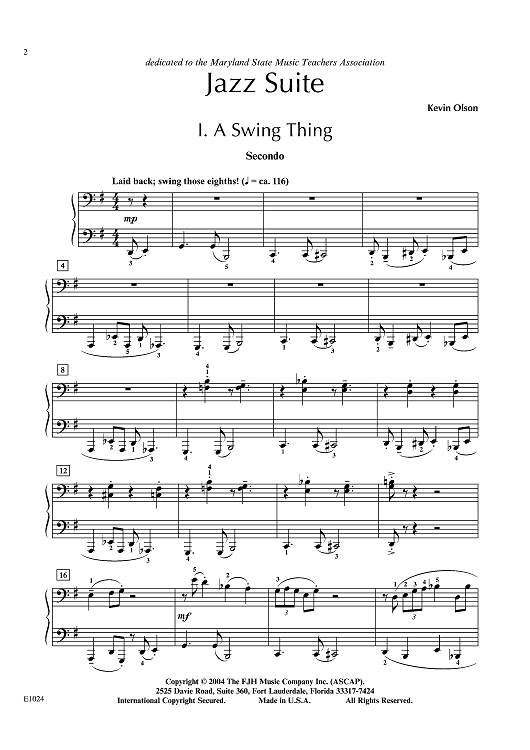 This one piano, four hand Jazz Suite is played out in four movements, exploring contrasting styles and keys, with fresh up-to-date sounds: A Swing Thing has an upbeat tempo, swing eights, walking bass, triplets and syncopation. A Little Latin is a more laid back style, with syncopation, accents, and somba rhythms. Ballad for Julia slows to a romantic mood, with 9th, 11th, and 13th chords used in the harmony. BlueWaltz rounds out the suite in a spunky, lively style, with syncopation and chromaticism.