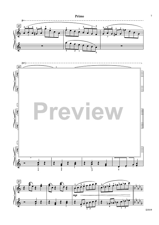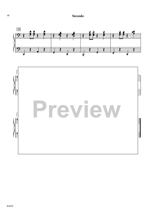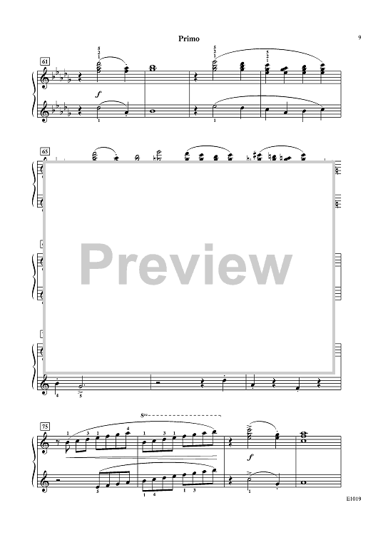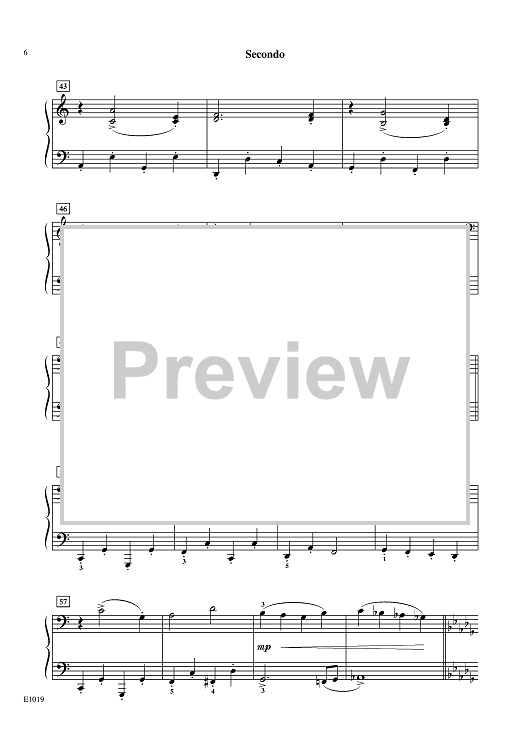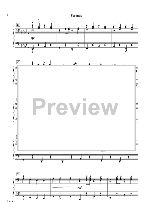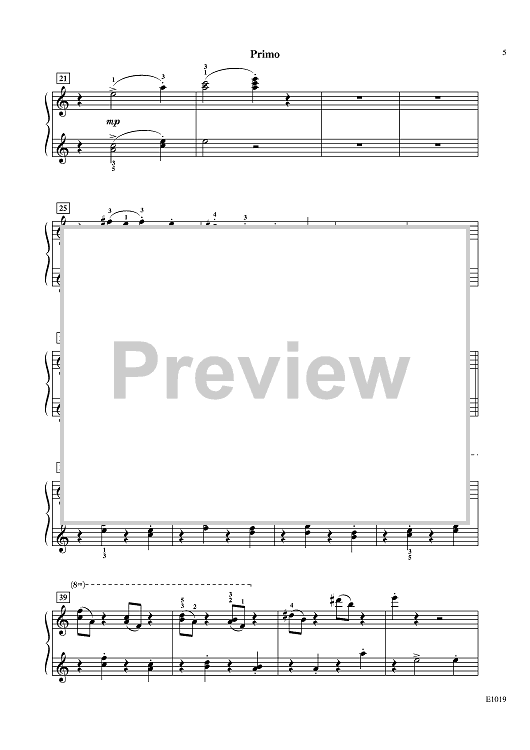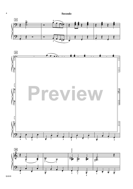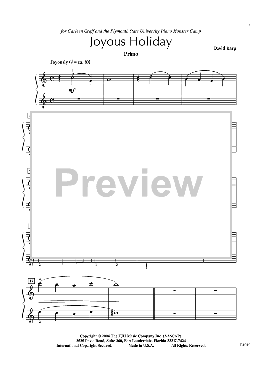 David Karp’s peppy one piano four hand ensemble piece, Joyous Holiday, takes off in cut time, with an upbeat, lightly-syncopated tune (Primo), set against a steady, staccato, broken-chord march (Secondo). Some adventurous, bluesy travels add some fun splashes of color, but never stray too far for too long! Eighth-note scale runs in both hands have a "run-and-jump" feel - the melody only returning, as usual, on the off beat. Performers and listeners alike will find this one a joy!