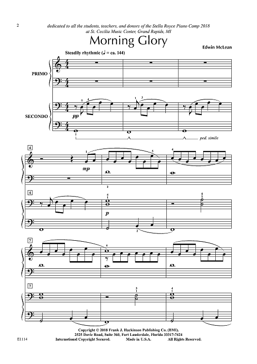 Aptly named after the morning glory flower, this duet starts out quietly and then, as the texture thickens, it unfolds to greet the morning sun. In the key of C major, there are hand shifts but even small hands can quickly learn the easy-to-play patterns.
