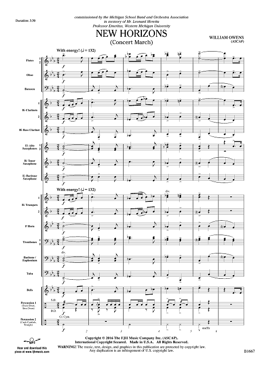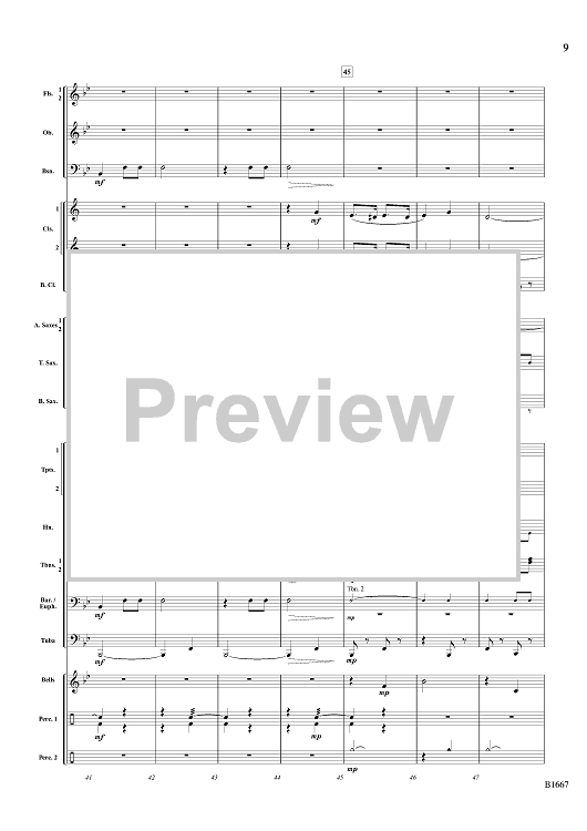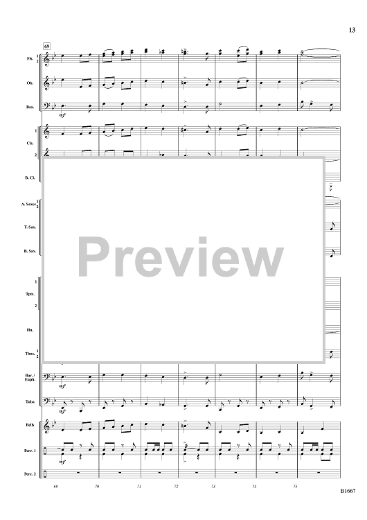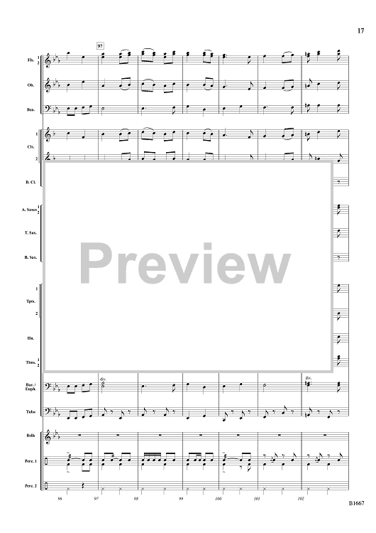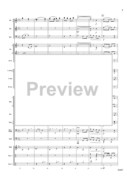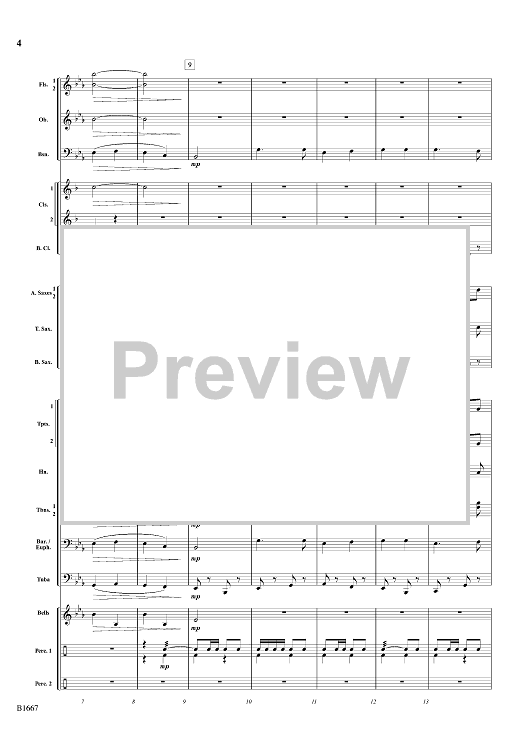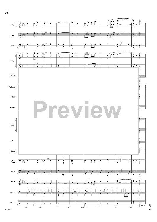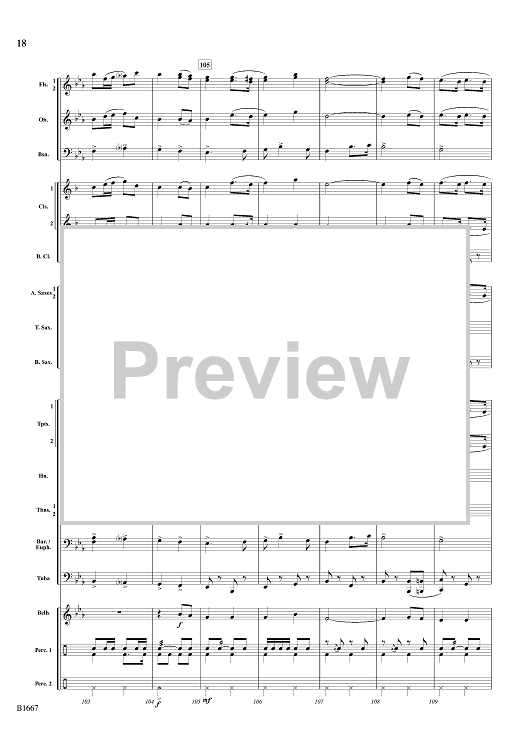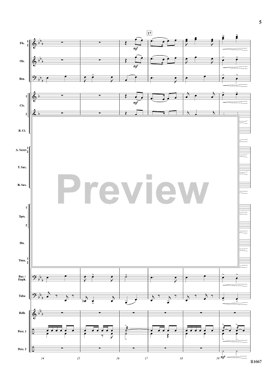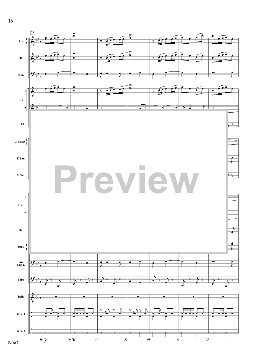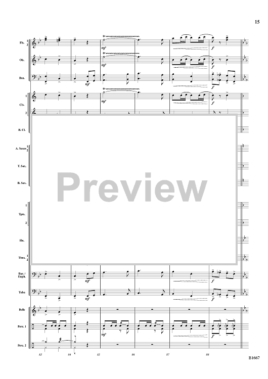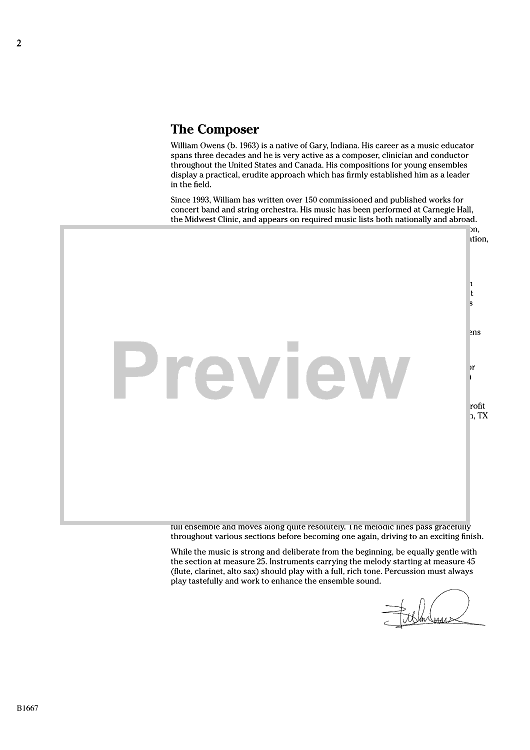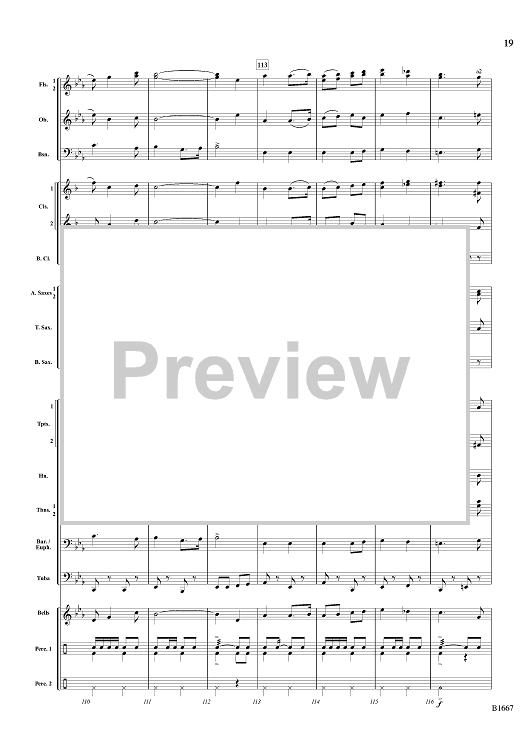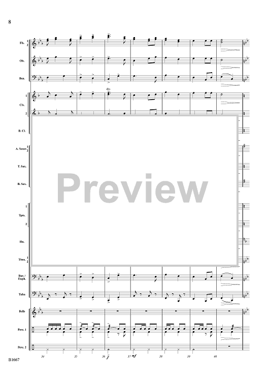 Driving rhythms and robust harmonies are very much at the heart of this highly spirited concert march! Energy and excitement abound as tuneful melodic lines adorn your performance with varying styles and colors. Great scoring and colossal sounds! (2:00)