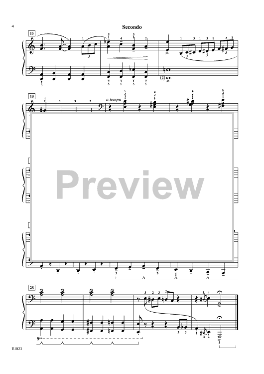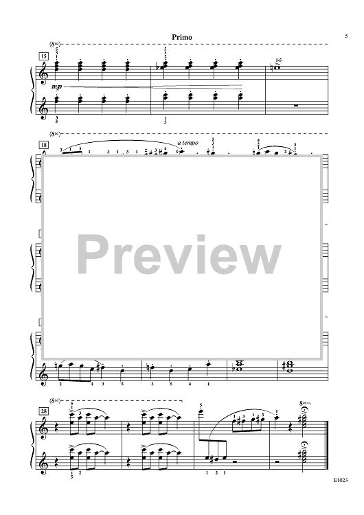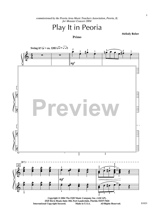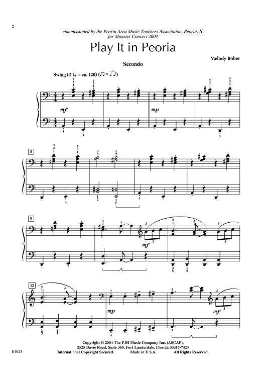 For adventurous students who seek a richer, more dramatic sound, Play it in Peoria is now available as an intermediate-level duet. Jazzy and playful, it offers swing eighths, syncopation, chromatic passages, and a variety of articulations, as well as the "show-biz" effect of the stride-bass left hand in the closing section.