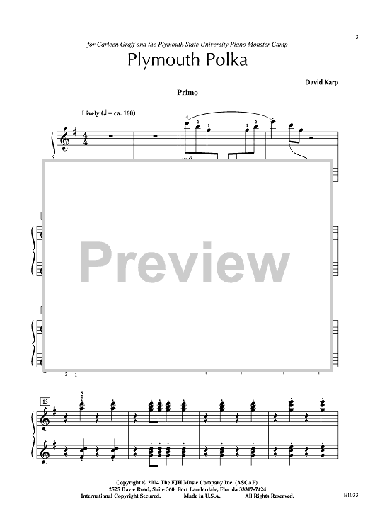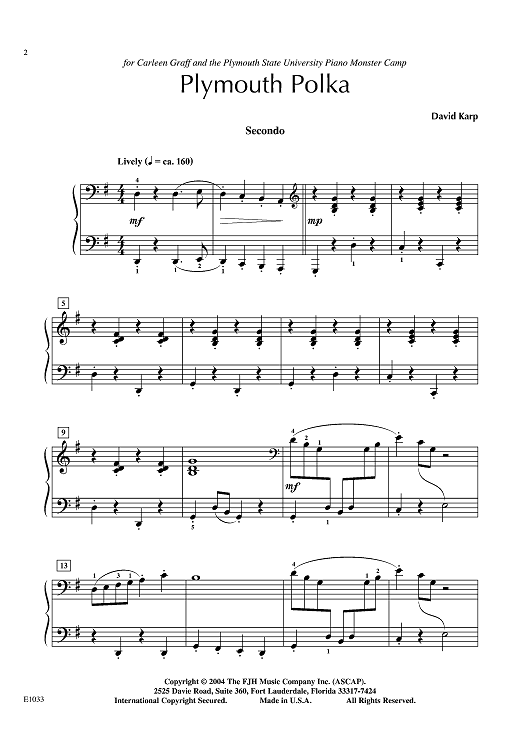 From the familiar two-bar introduction, through its rhythmic accompaniment patterns, this piece is all polka! It was created for the Plymouth State University Piano Monster Camp, making it a perfect one-piano four-hand festival selection. Both performers will enjoy the melodic interplay between the two parts.