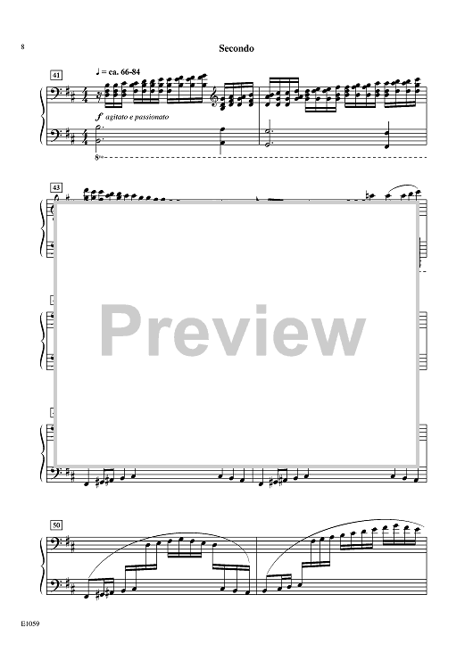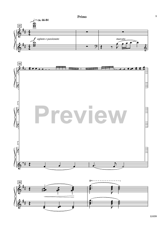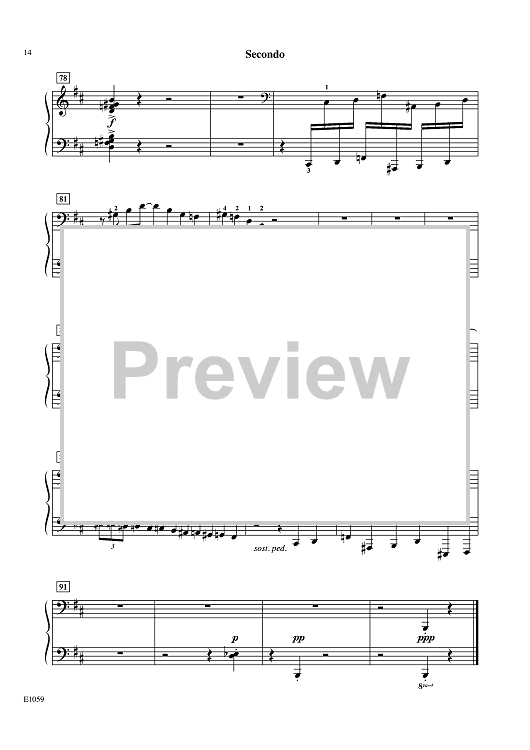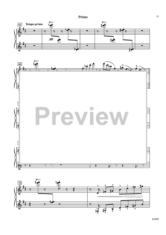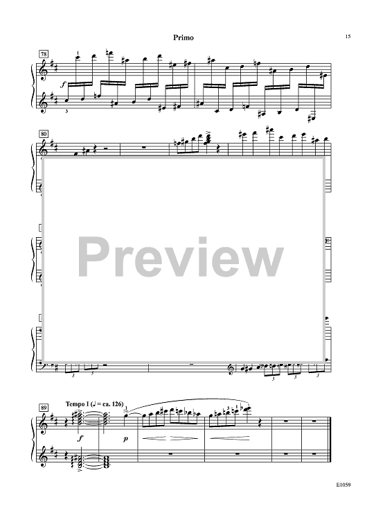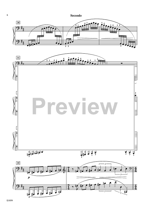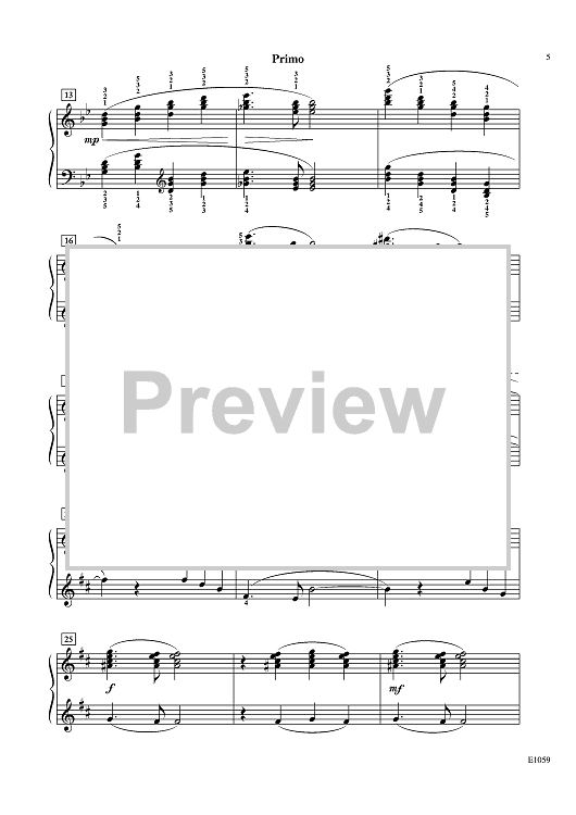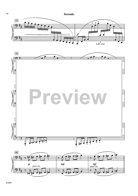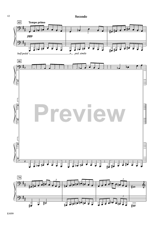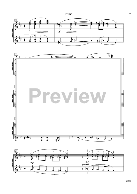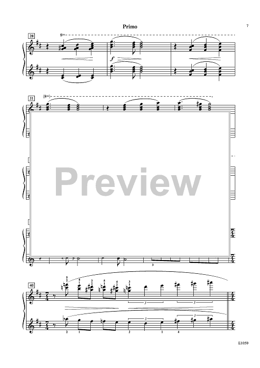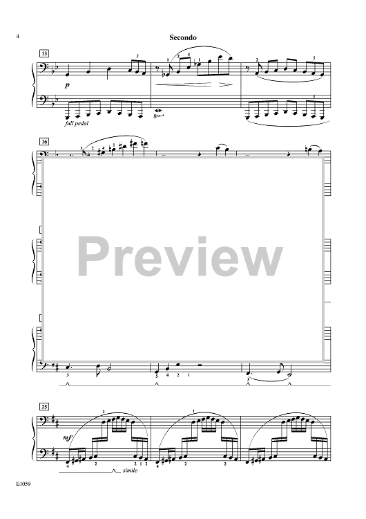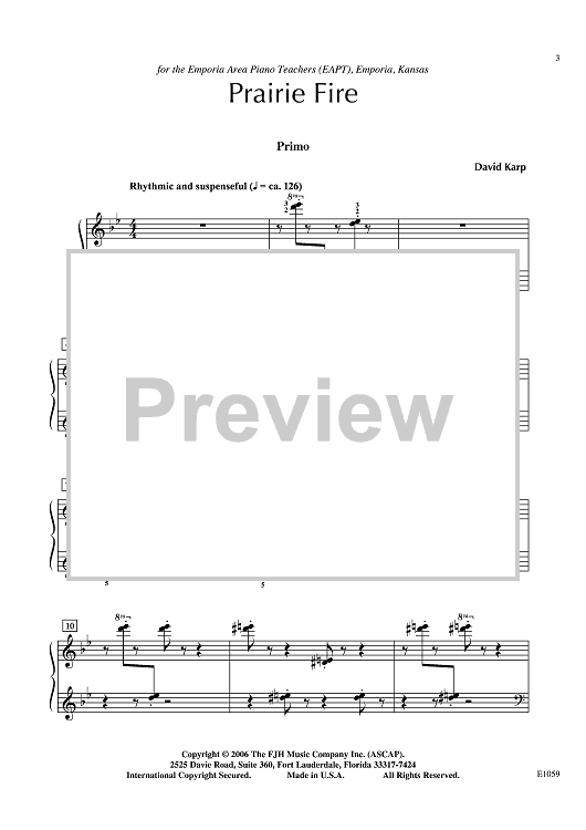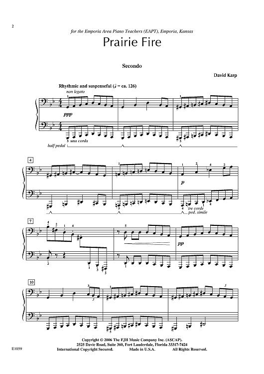 Labeled "Rhythmic and suspenseful," and written for the Emporia Area Piano Teachers of Emporia, Kansas, this duet will undoubtedly be a unique and challenging experience for any late intermediate/early advanced pianist. Both parts contain an equal amount of technical and musical demands, utilizing several eighth and sixteenth note passages, accidentals, and chromaticism.