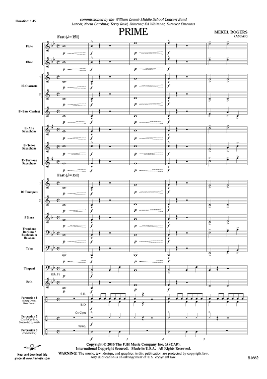 Incredibly clever and cross-curricular! This fast-paced work is filled with hidden references to prime numbers woven throughout the piece. Some are easy to find (all rehearsal numbers are prime and every measure includes a prime number of notes!), while others are hidden deep in the musical texture. Comfortable ranges and solid scoring allow students to develop more musical concepts as they search the music for all things "prime." Amazingly unique! (1:45)