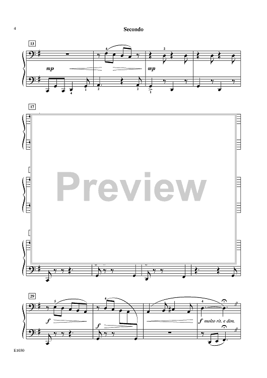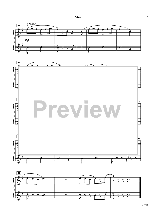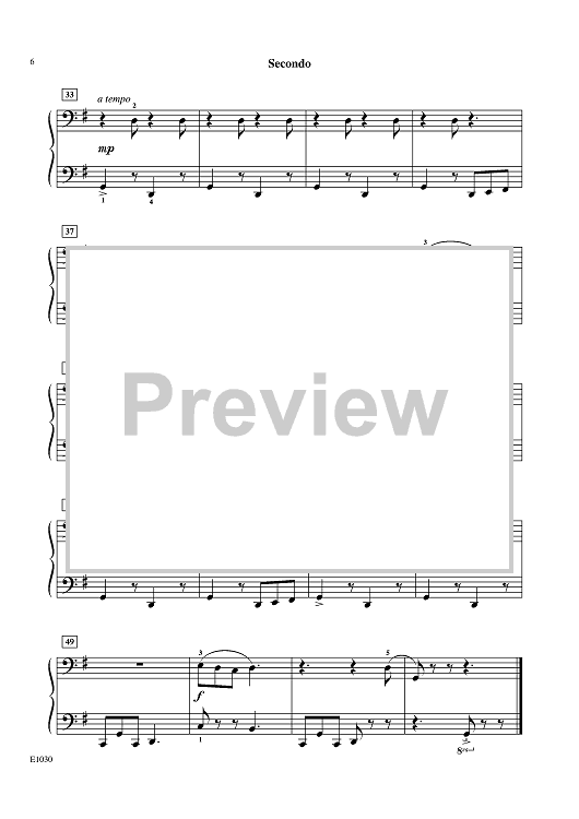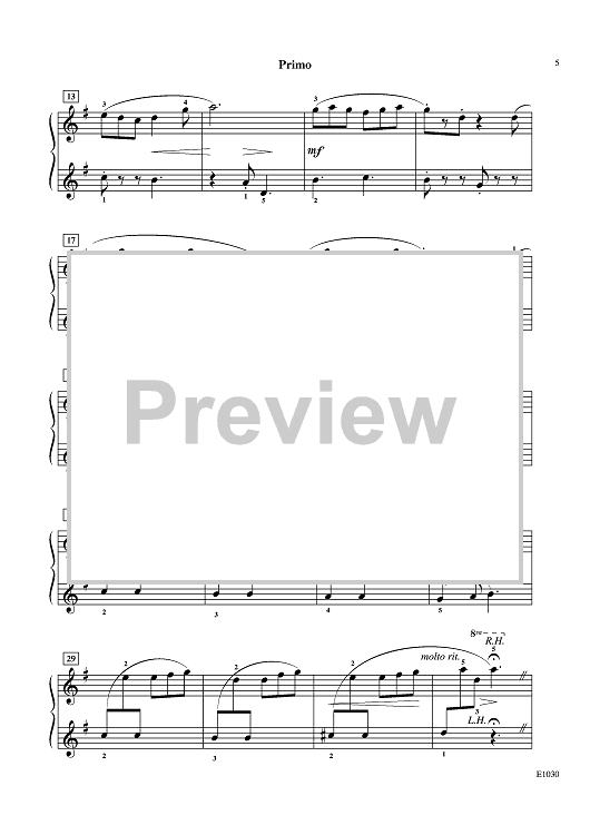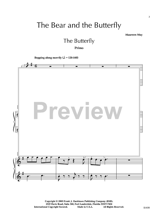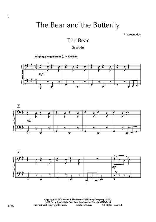 "Bopping along merrily" is the tempo marking for this ensemble selection, telling us that it's time for some fun. The bubbly, fluttering Primo (The Butterfly) and the repetitive, lumbering Secondo (The Bear) wonderfully sketch the imagery. Listen for the echoes as Bear and Butterfly play together. This one will have much appeal with sibling teams.