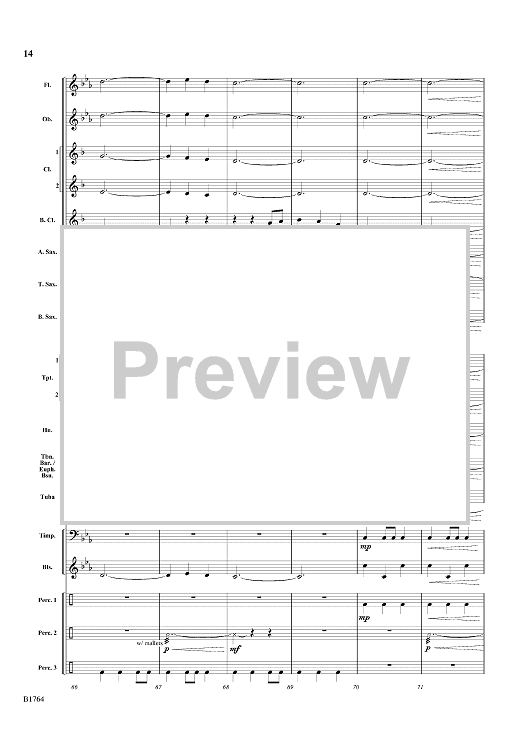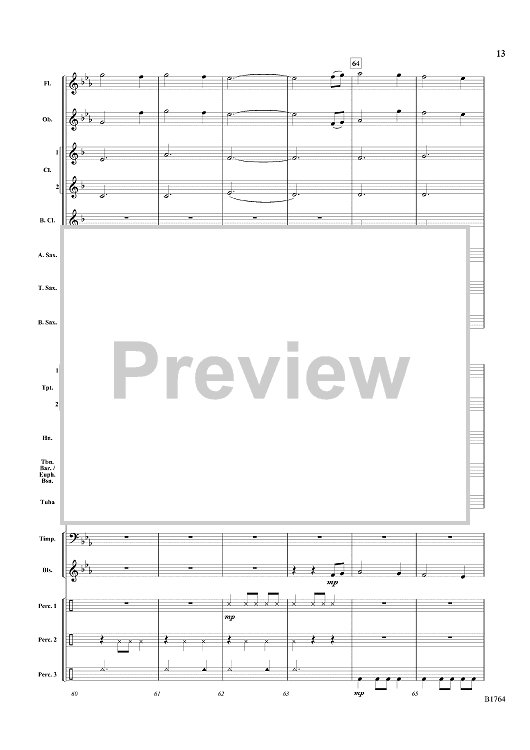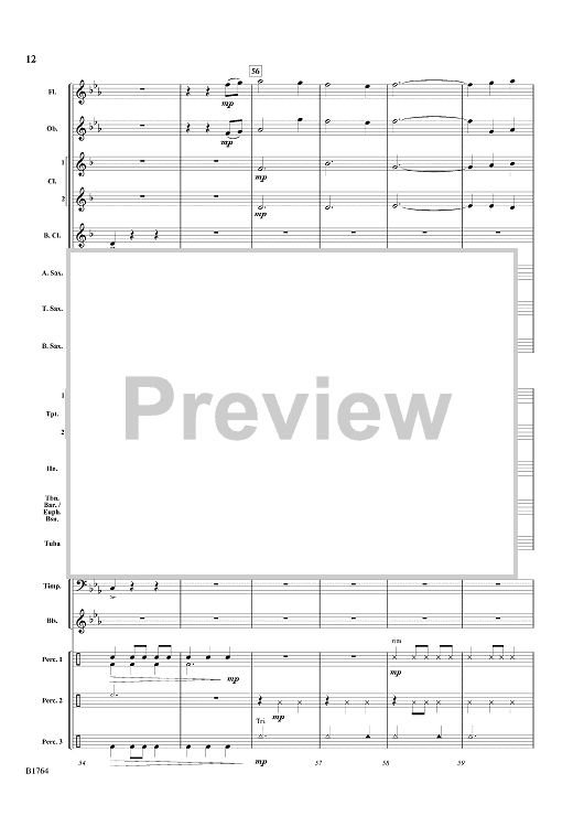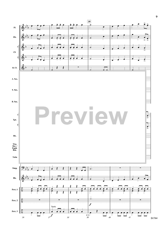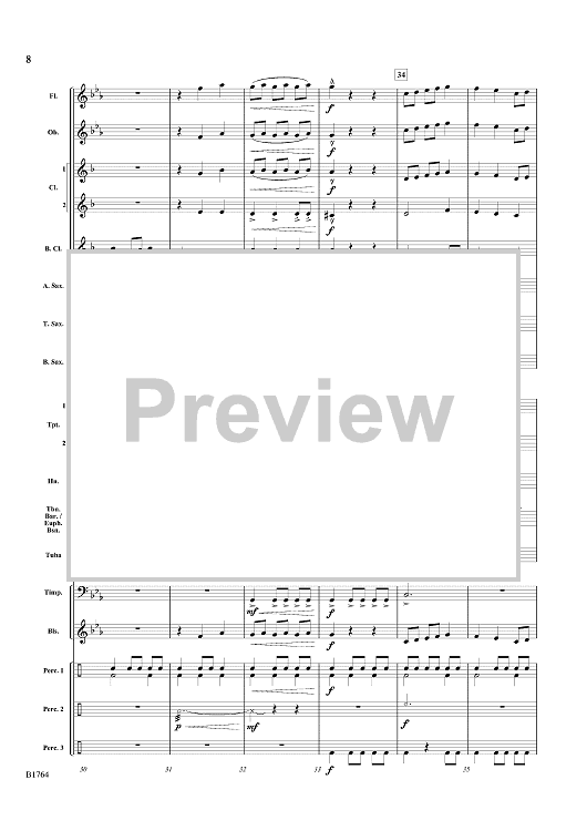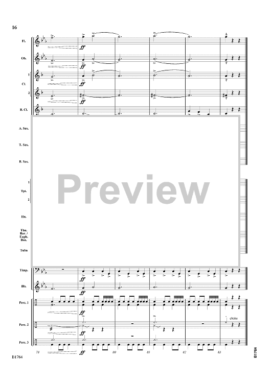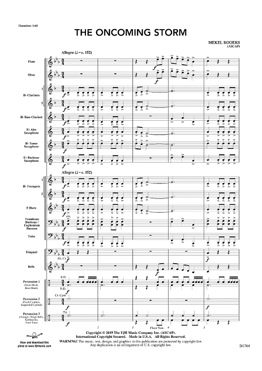 Modern harmonies combine with fast rhythmic figures to create an intense musical experience. A wealth of percussion colors add to the overall effect and all wind parts are active while staying within comfortable ranges. A great way to get the students and audience excited as they anticipate the coming of the storm! (1:45)