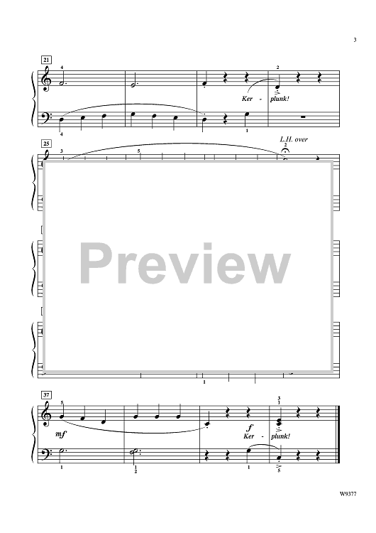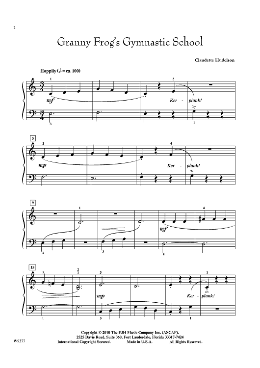 This fun elementary level piece is written in 3/4 time, and contains a variety of articulations from slurs, staccatos, and accents. The left hand gets a turn playing the melody while also crossing over the right hand in one part. Students will like playing the accents depicting the sound of the frog going kerplunk! These funny frogs flopping around in gymnastic school will be a hit with students!