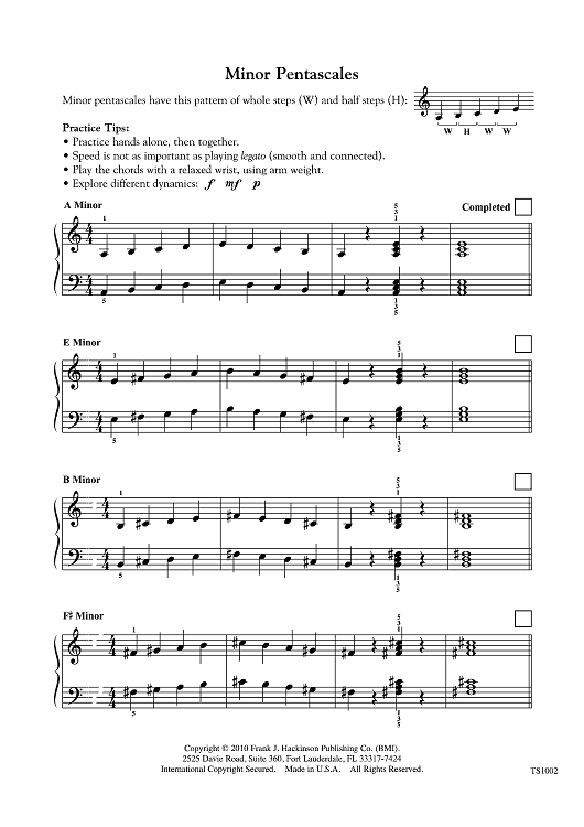 Convenient and easy to use, the Basic Technique Sheets provide an organized way for students to become proficient in necessary technical skills: major and minor pentascales, arpeggios, cadence chords, and one-octave scales. Each Technique Sheet includes valuable practice tips, check-off boxes, and brief explanations on the construction of scales, arpeggios, and cadence chords. Teachers will be pleased with the organized and clear presentation of these sheets, and students will feel a sense of accomplishment as they check off each technique they master!