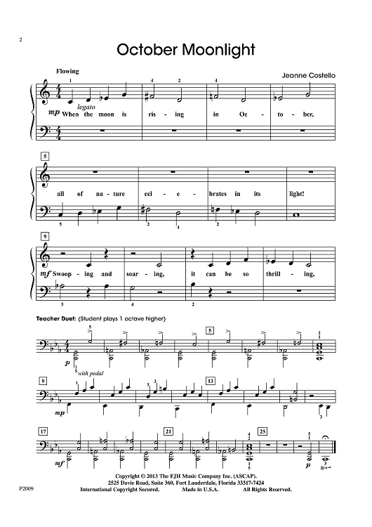 The melody weaves between the hands in this five-finger position piece with one shift for L.H. Accidentals are used in the student part and the teacher’s duet is in C minor. The lyrics tell the tale of a moon rising in October.