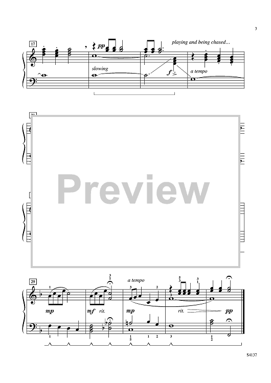 This musical narrative has a light, dreamy melody which follows the rabbits on their way. It uses a fun articulation where long notes hold while the other fingers sometimes "hop". Accelerating staccato triads depict a chase scene before the rabbits finally scurry home. Use this one as an introduction to Impressionism.