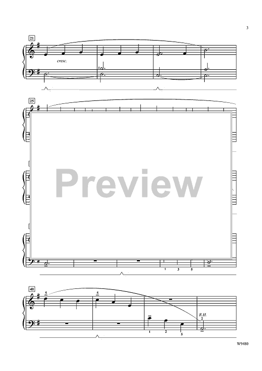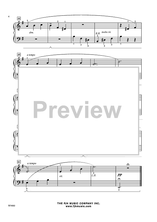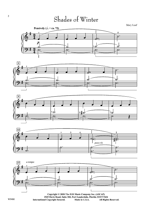Winter has its own special magic depicted here in the key of E minor. The piece begins with a pensive melody, followed by easy hand-over-hand arpeggios. Careful attention to pedaling is a must for this expressive solo. No eighth notes are used.